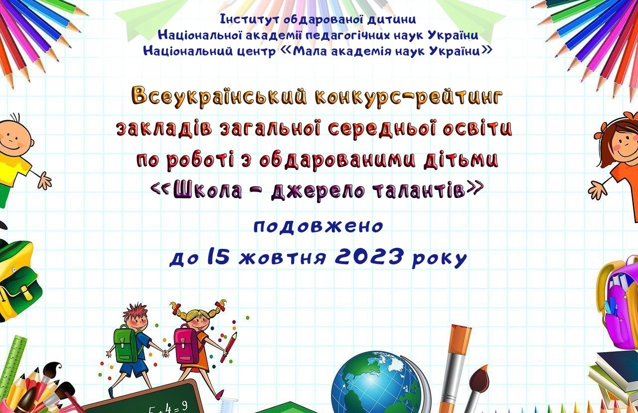Термін проведення Всеукраїнського конкурсу-рейтингу закладів загальної середньої освіти по роботі з обдарованими дітьми «Школа – джерело талантів» подовжено до 15 жовтня 2023 року.